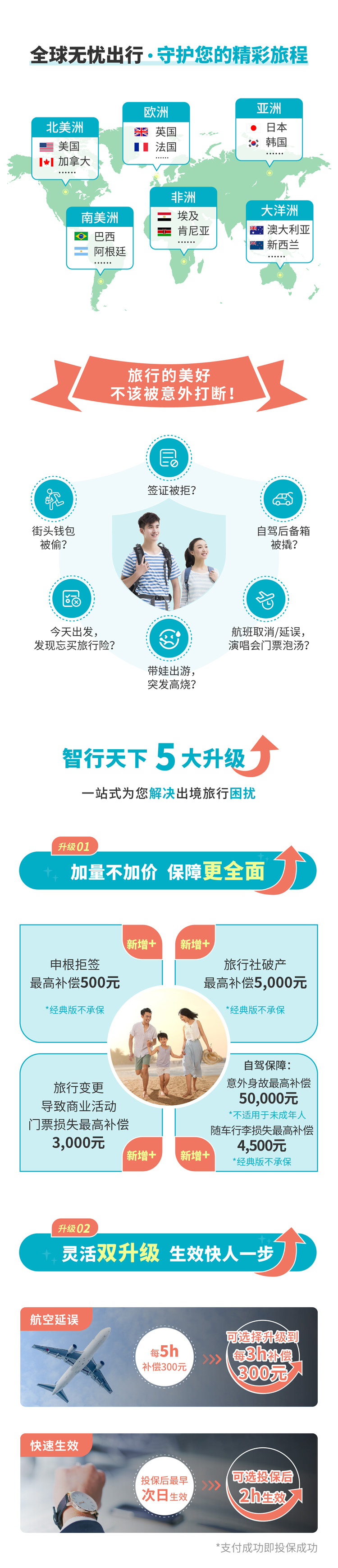 具体生效时间以保单载明为准 若投保人选择升级为“投保成功后两小时生效”,则该保单项下的旅行延误、行李延误、旅行变更及申根签证拒签的生效时间为投保成功后的次日。 |